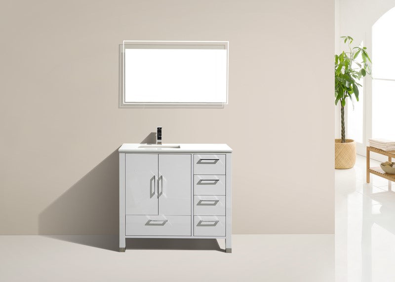 The Anziano Bathroom Vanity provides a contemporary design perfect for any bathroom remodel. The ample storage in this free-standing vanity includes four doors and fourteen fully functional drawers lining the cabinet, with chrome hardware accents. The pure white Quartz countertop it is made using nano technology, that makes it virtually impenetrable and maintenance free.