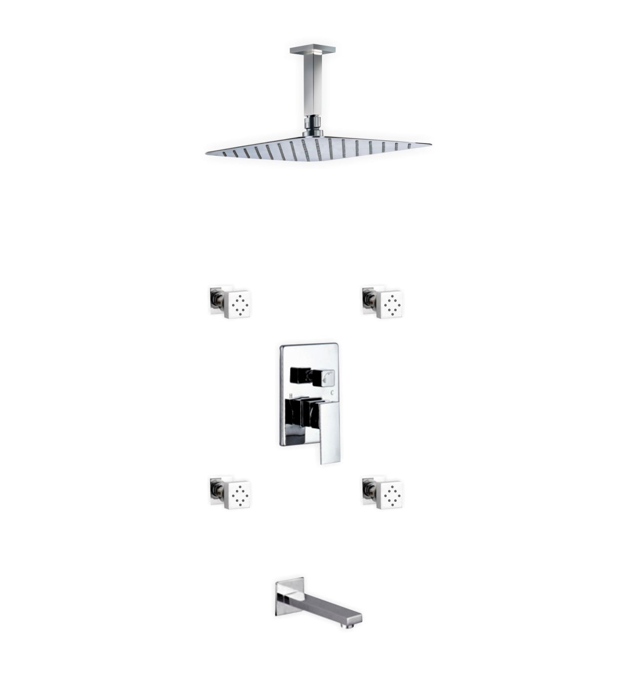 Aqua Piazza Shower Set w/ 12" Ceiling Mount Square Rain Shower, Tub Filler and 4 Body Jets